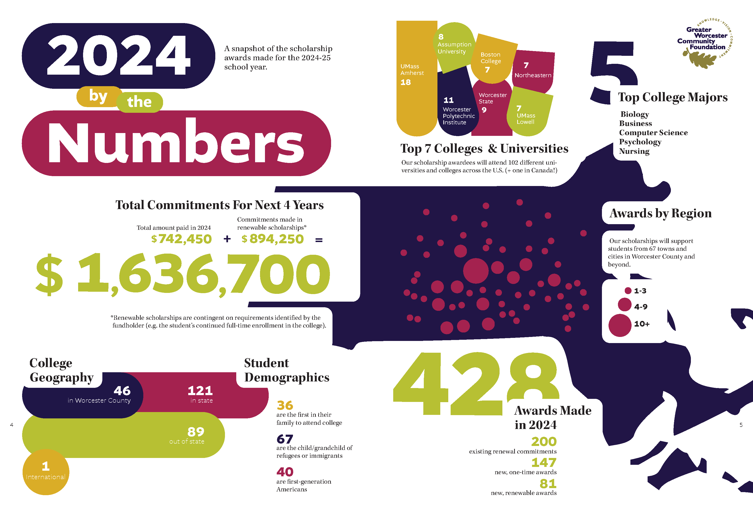 For more information about Greater Worcester Community Foundation and its scholarship program, please visit https://greaterworcester.org/for-students/scholarships-overview or view the attached 2024 By the Numbers graphic. Our 2024 Scholarship Yearbook, featuring our 428 scholarship recipients, will be published later this fall.